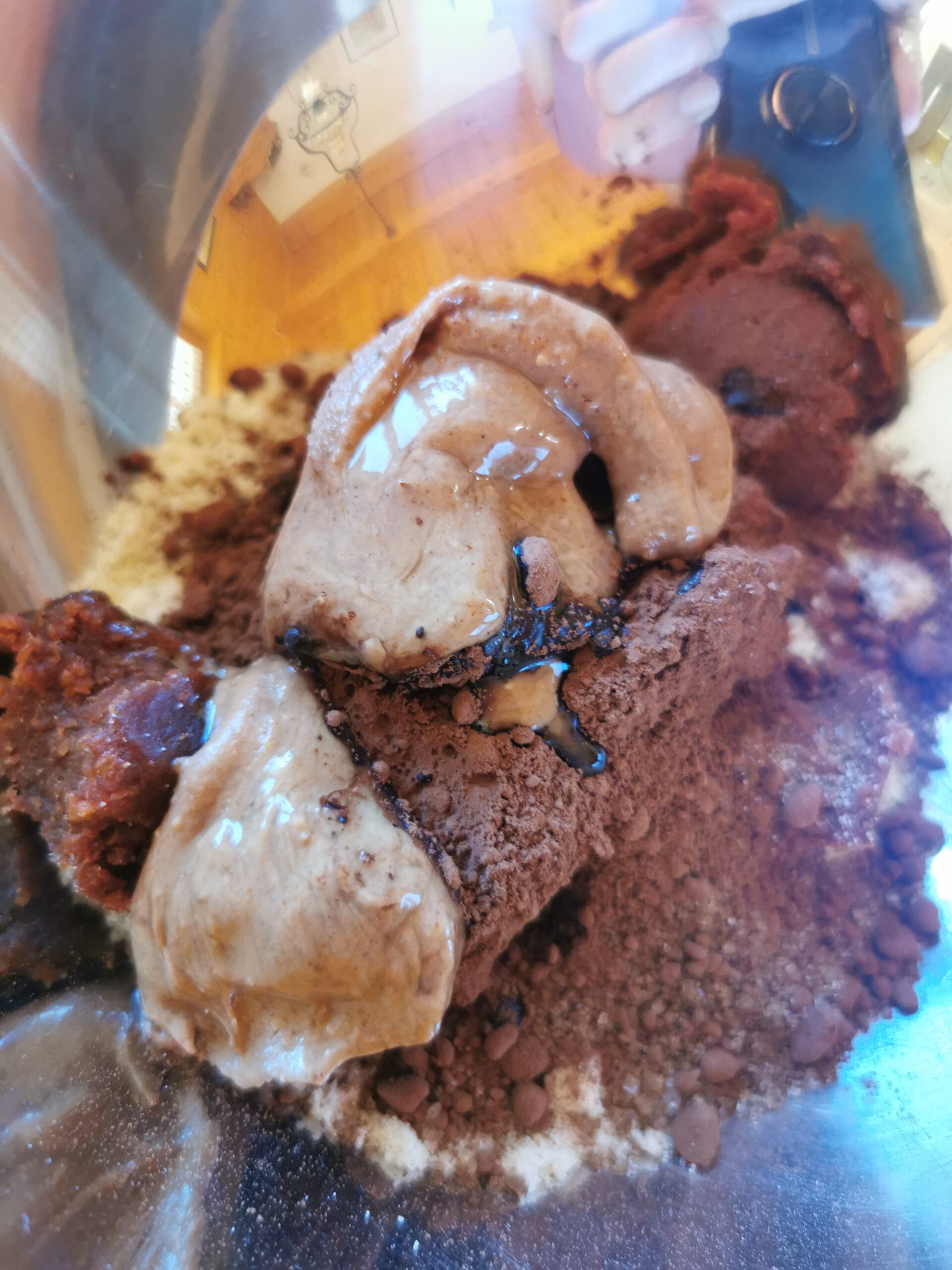 - Kakao und Vanilleextrakt: Füge das Kakaopulver und den Vanilleextrakt hinzu und mixe weiter, bis alles gut vermischt ist und eine gleichmäßige Masse entsteht. Die Schokostückchen kommen ganz zum Schluss dazu.