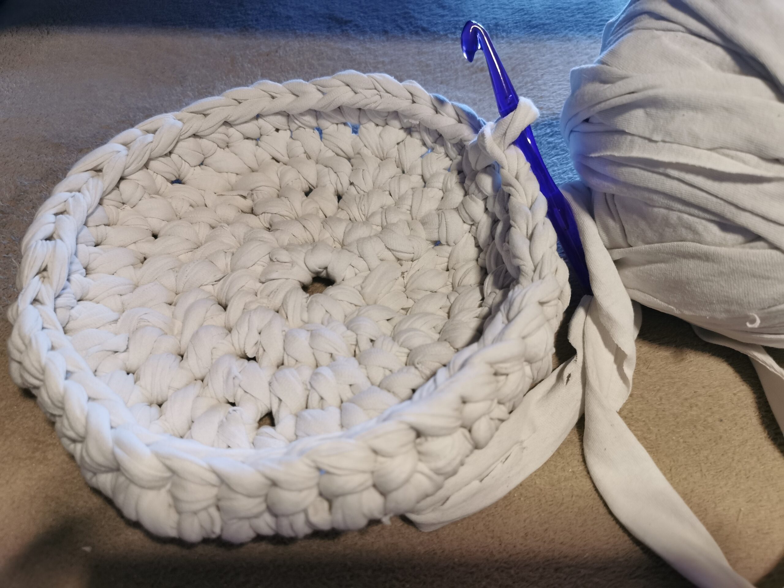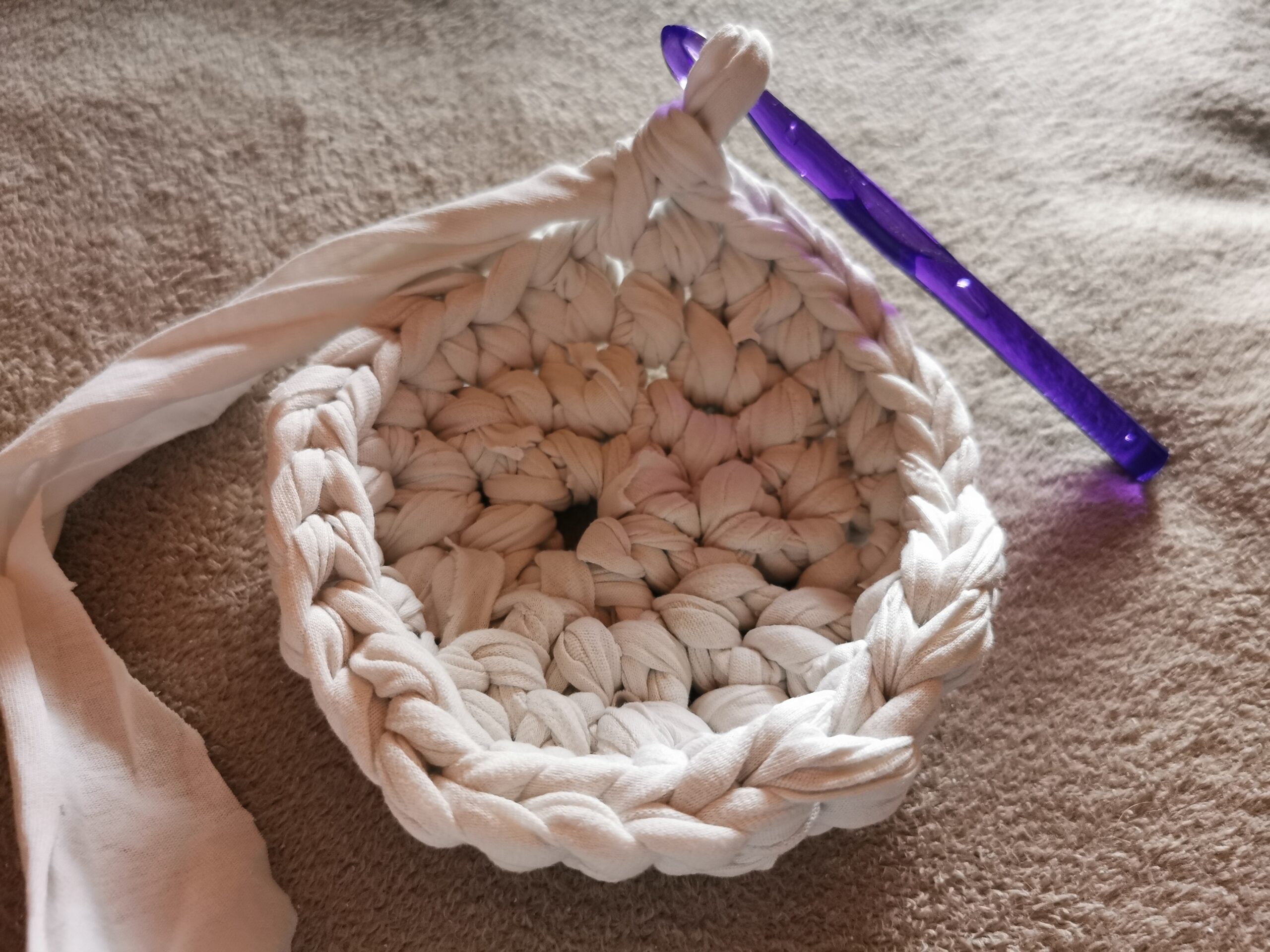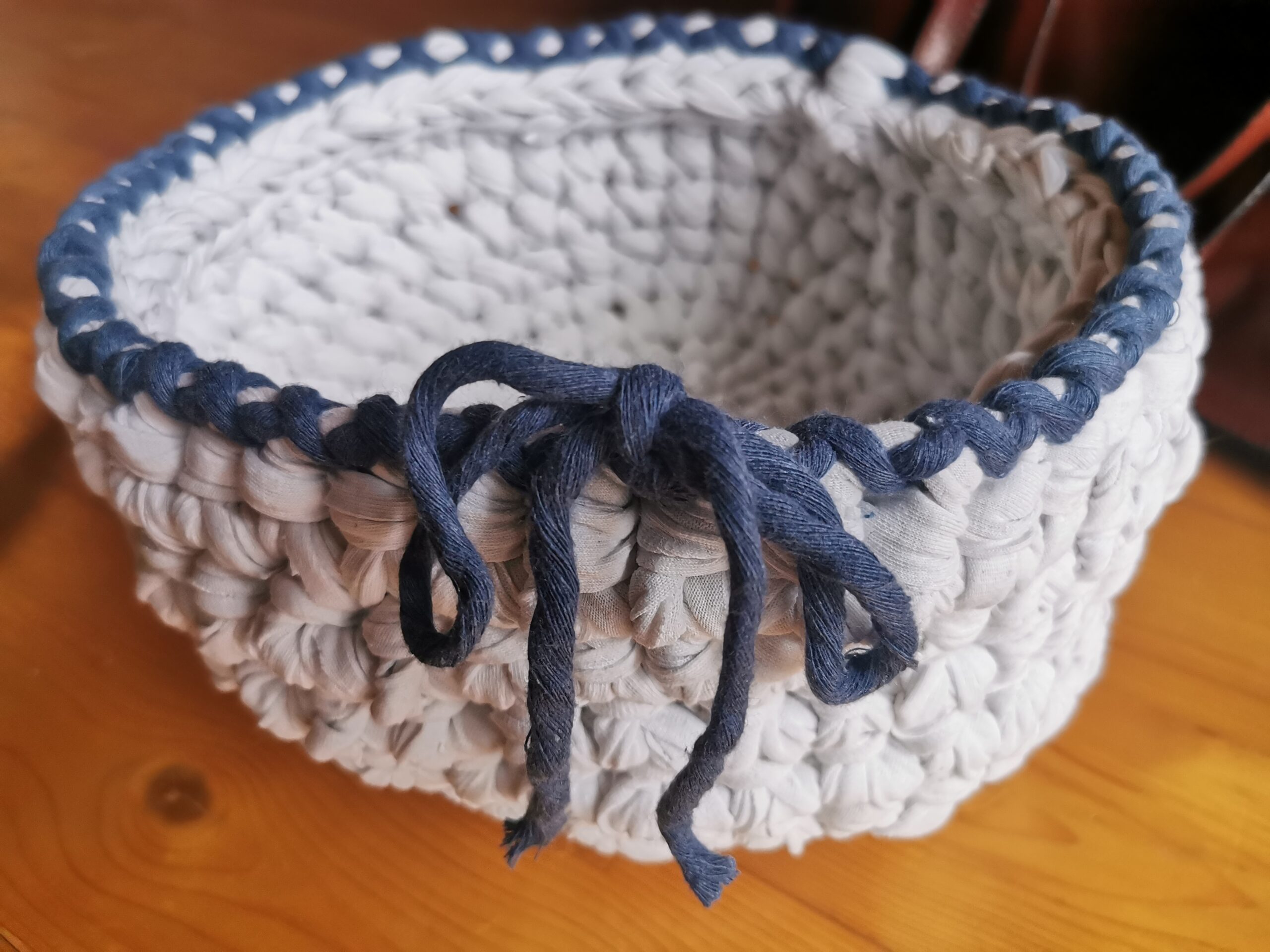 Mit dieser Technik kannst du aus alten Bettlaken wunderschöne, nachhaltige DIY-Projekte umsetzen. Dein gehäkelter Korb eignet sich hervorragend zur Aufbewahrung von Wolle, Kosmetika oder anderen Kleinigkeiten. Wenn du farbige Bettlaken hast, kannst du schöne Akzente setzen.