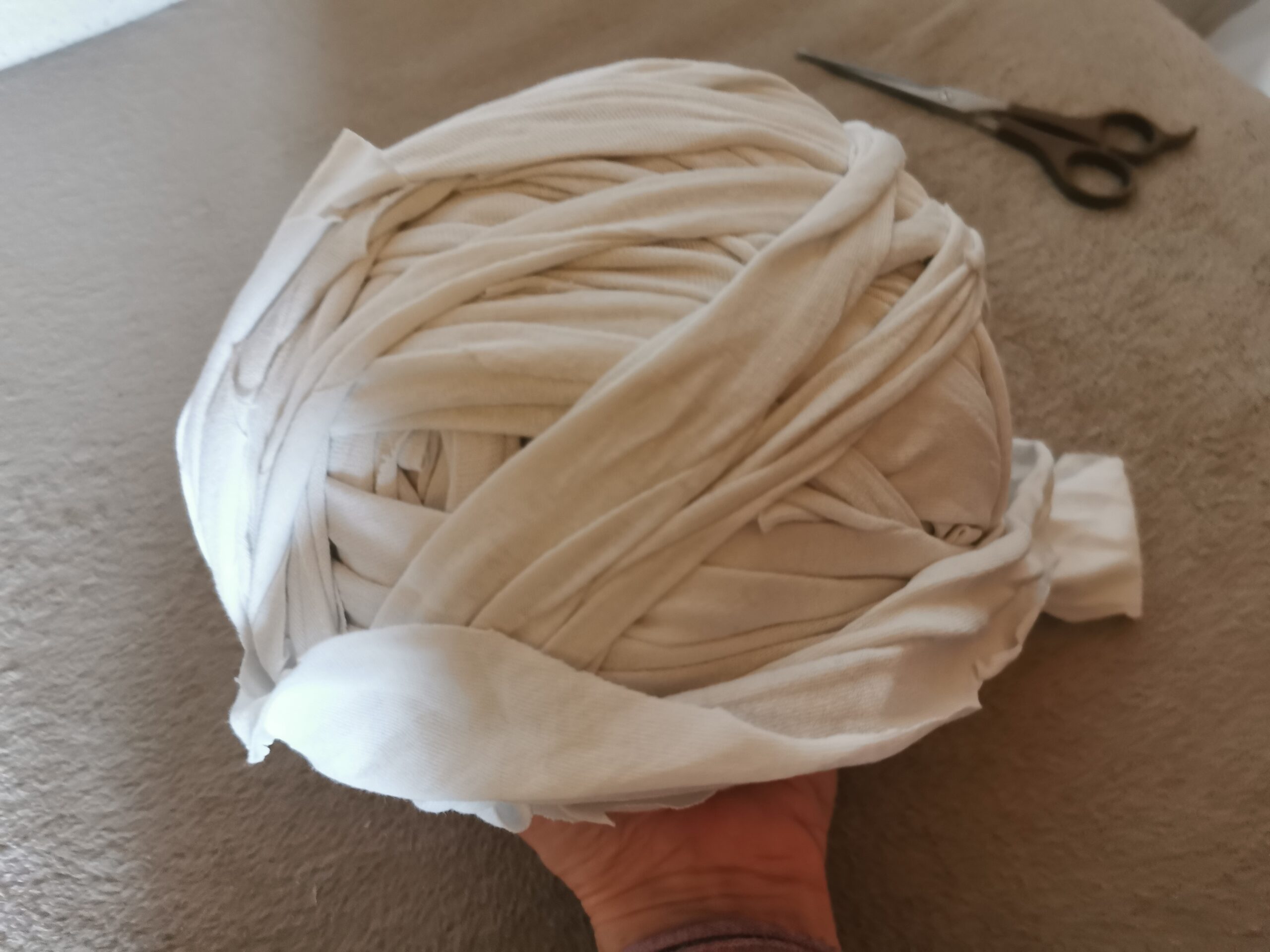 Breite das Bettlaken auf einer ebenen Fläche aus. Schneide es zunächst in lange, etwa 2-3 cm breite Streifen. Beginne dabei an einer Ecke und schneide spiralförmig, um einen durchgehenden Garnstrang zu erhalten. Falls du kleinere Stoffstücke hast, kannst du auch einzelne Streifen zuschneiden und diese mit kleinen Knoten verbinden.